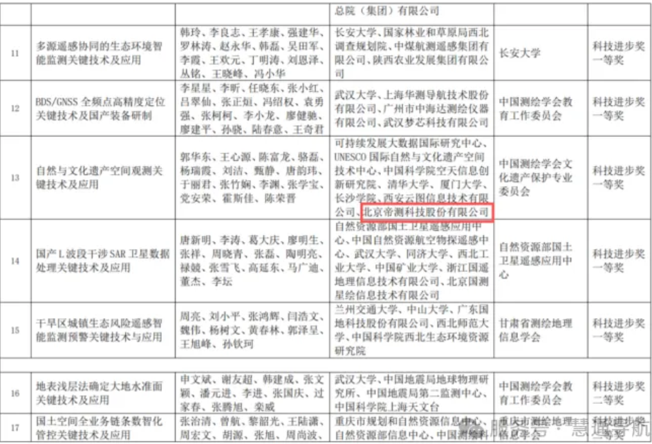 值得关注的是,慧通导航控股公司—— 北京帝测科技股份有限公司(以下简称 “北京帝测”)凭借《自然与文化遗产空间观测技术及应用》项目,在众多参评项目中脱颖而出,成功斩获 2024 年度自然资源科学技术奖(测绘组)一等奖,这一荣誉不仅是对北京帝测技术实力与创新能力的充分肯定,更是行业对其在自然与文化遗产保护领域所做贡献的高度认可。